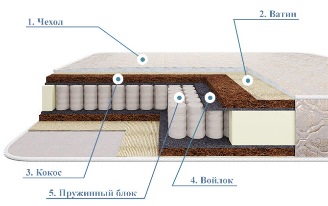 2. Ватин. Настилочный материал смягчает давление пружин на тело, при этом сохраняет правильное распределение веса на поверхность матраса. Обладает теплоизолирующими свойствами, помогает сохранить комфортную температуру спального места во время сна.