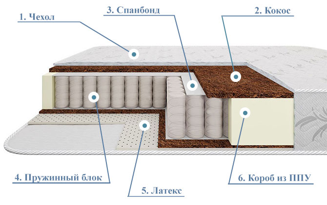 - Кокос (30 мм и 10 мм). Завершающим слоем наполнителя матраса с одной стороны является обработанная латексом кокосовая койра толщиной 30 мм. За счет этого с одной стороны матрас жесткий и имеет корректирующий ортопедический эффект. Также кокосовая койра толщиной 10 мм используется в качестве компенсирующего слоя между латексом и остальной частью матраса.